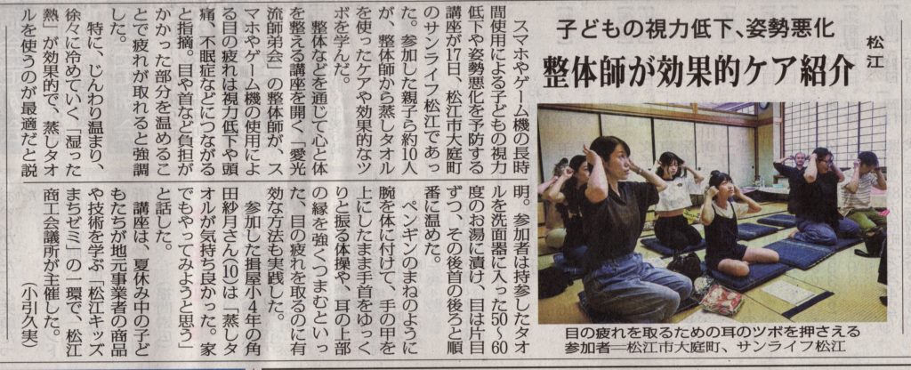 ご興味のある方はぜひご参加ください!愛光流師弟会 #山陰中央新報 #新聞掲載 #松江キッズまちゼミ #松江市 #島根県# 子育て #スマホ育児 #視力低下 #姿勢改善 #目の疲れ #子どもの健康 #体験講座# セルフケア